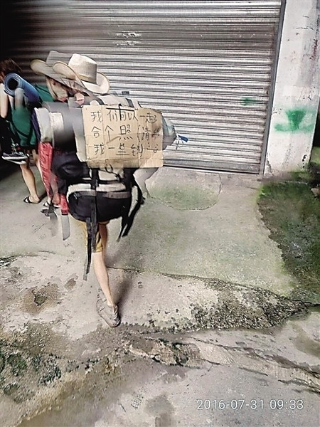 他们没带一分钱,希望通过搭乘顺风车或者“乞讨”方式完成旅行。因此,他们随身还带着许多牌子,上面有中文写到:“我们可以一起合照,请给一点钱”、“请给一点钱,去游中国完成梦想”等。