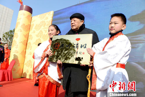 资料图:国学大家冯其庸先生(中)。中新社发 李一芳 摄