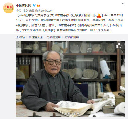 本月,冯其庸50年前手抄的《瓜饭楼抄庚辰本石头记》刚刚由青岛出版社出版。青岛出版社副总编辑刘咏在接受中新网(微信号:cns2012)记者电话采访时直言,“就在这个月,出版社还去家中看望了冯老,没想到那么快就走了”。