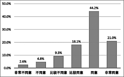 数据分析结果也显示,这一代人并没有出现社会上所担心的价值观上的金钱与权力至上的问题。在对金钱的态度上,对于“有钱什么都能买到”这种说法,做出倾向于同意的选择的只有11.7%,而表示出反对倾向的则高达88.3%。而对于“金钱是最重要的衡量个人价值的标准”这个说法,只有16.4%倾向于同意,倾向反对的则高达83.4%。在对权力的看法上,只有16.3%倾向于同意“有权就有一切”的说法,倾向反对的则高达83.7%。同时,也只有31.4%倾向于同意“我崇拜权力”这种说法,选择倾向于不同意的则高达68.6%。