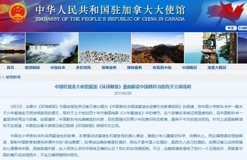 针对加拿大《环球邮报》近日关于中国教科书的歪曲解读和不实报道,中国驻加拿大大使馆日前已致函该报表明中方立场。