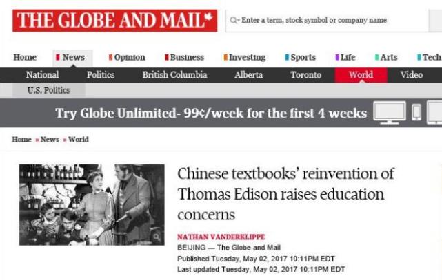 5月3日,加拿大《环球邮报》刊登该报驻京记者万德山题为《中国教科书捏造爱迪生故事引发教育担忧》的报道,称中国小学教科书中一篇关于少年爱迪生巧用发明救母的课文,取材于上个世纪四十年代美国电影《少年爱迪生》中的情节。这个故事后来被证明是虚构的,但中国教科书一直坚持采用这个故事。该报道称,中国教科书充满编造的内容,目的是强化对青少年的意识形态教育,服务于中方的政治目的。