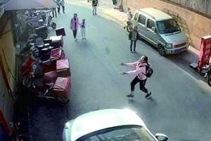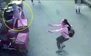 楼上发生了什么?引得一大早上学的学生驻足观看?就在女孩再次进入监控画面大概5秒之后,视频中显示,这名背着书包的小女孩突然伸出双手做托接的姿势向前跑了几步,而就在这一瞬间,一名娃娃从高处坠入监控画面当中,擦碰到两辆送餐车的送餐箱坠落至水泥地面。紧接着,小女孩上前抱起娃娃,与匆匆赶到的一名女子对话后,把孩子交给这名身穿红色上衣的中年女子。