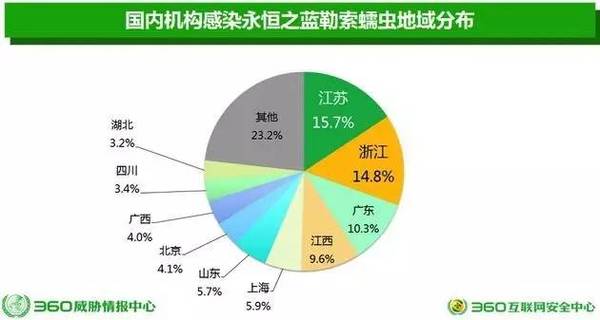 360威胁情报中心显示,截至到当天下午19:00,国内有28388个机构被“永恒之蓝”勒索蠕虫感染,覆盖了国内几乎所有地区。在受影响的地区中,江苏、浙江、广东、江西、上海、山东、北京和广西排名前八位。