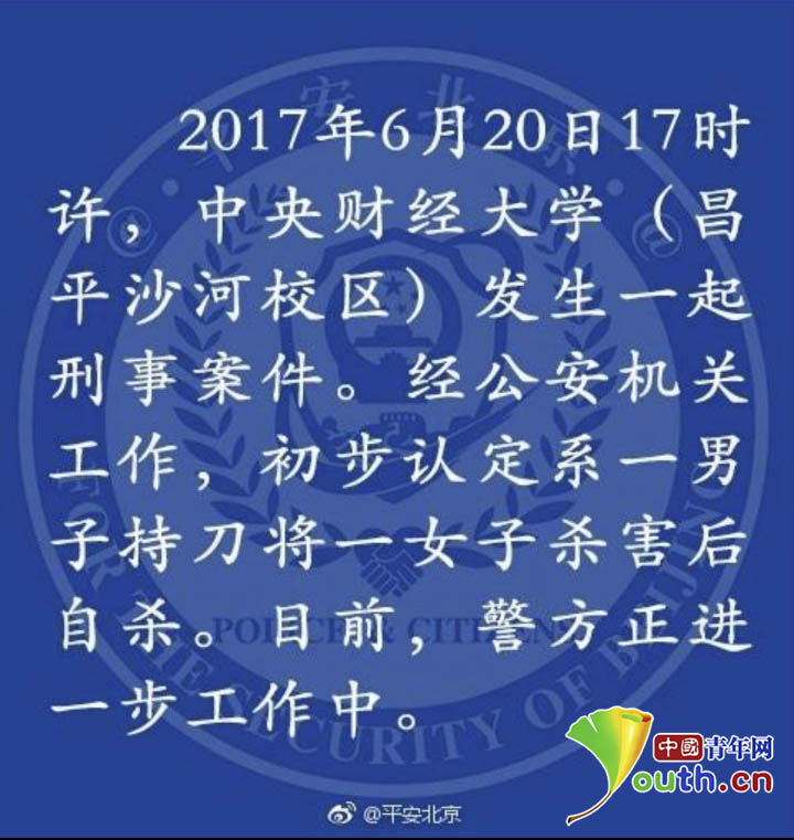 通报称2017年6月20日17时许,中央财经大学(昌平沙河校区)发生一起刑事案件。经公安机关工作,初步认定系一男子持刀将一女子杀害后自杀。目前,警方正进一步工作中。