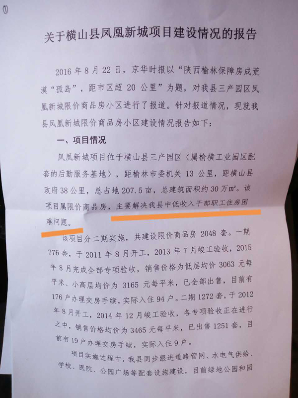 2016年的文件《关于横山县凤凰新城项目建设情况的报告》。