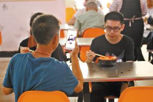 ■一位家长用手机记录孩子第一次在大学食堂吃饭。
