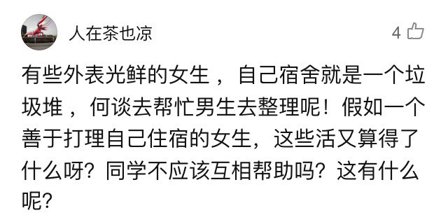 这标题反过来,男生帮助女生抬行李,抬水桶,抬实验设备等等,我好奇还有没有这么多人会发出一致的声讨。同学之间,就是互帮互助,可能扫地不算什么大事,大家觉得很过分,我就想问问,什么情况下,女生去帮助男生是名正言顺的呢?至于什么不能自理什么的,也不是靠女生帮忙能够解决的问题了。