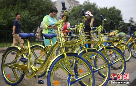 2017年6月8日,民众在北京街头扫码租用一款“土豪金”色的酷骑共享单车。中新社记者 杨可佳 摄