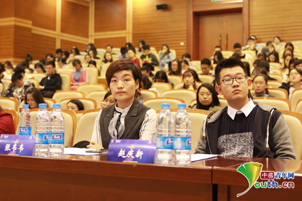 图为评委与同学们认真观看选手的精彩演讲。中国青年网通讯员 张璟垚 摄