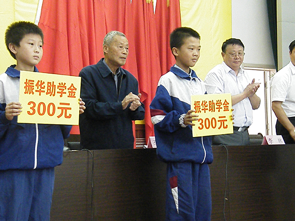 李振华在“振华奖学扶贫基金会”上给学生颁发助学金。