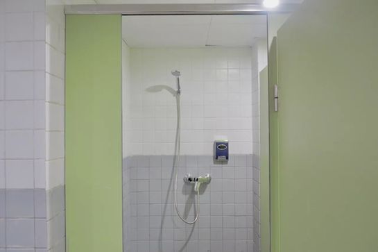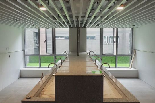 每层有数处盥洗台和一间公共浴室,两间公共卫生间,同学们使用的时候可以就近,非常方便。盥洗台每个龙头都是插卡出热水,水费按原价收取,热水24小时开放。