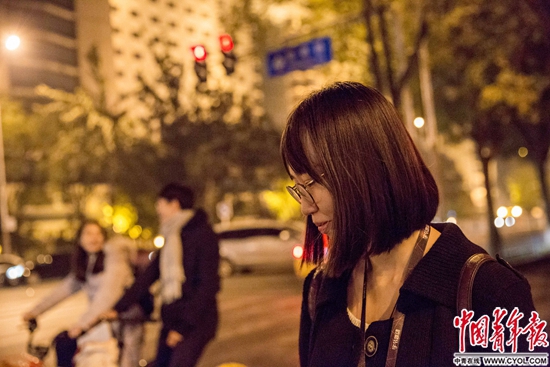 10月30日晚11点,下班后的傅馨怡步行回出租屋。日语专业的她选择通过实习来确定自己的发展方向。没有晚班的时候,她会留在办公室自学统计学和推荐系统。此前没离开过家乡天津,现在她却希望留在北京发展。