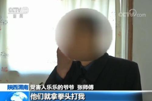 受害人乐乐的爷爷 张师傅:娃让人家打了以后跑回到家里边,我在门口他们有两个男的两个女的,我就问谁刚才打我娃,就这样问他们,他们就说你说话你手指什么,我说你打我娃我还不敢指你,他们就拿拳头打我。下面这个牙齿掉了,上面两颗牙齿松动了。