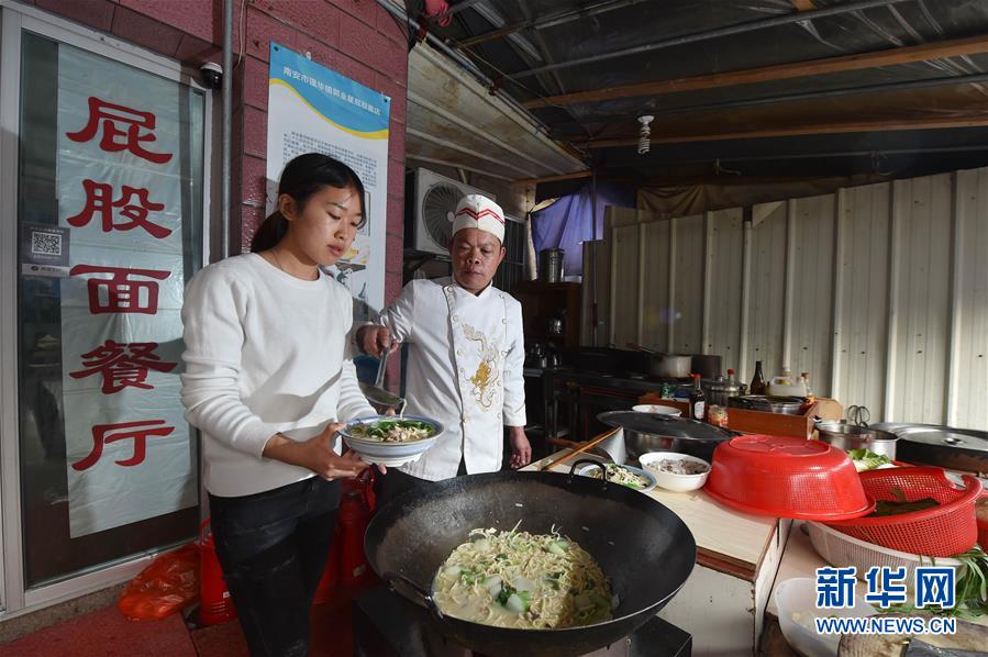1月3日,郭炜兰为远道而来的食客端上面条。新华社记者 宋为伟 摄