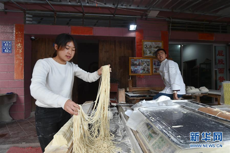 1月3日,在福建省南安市蓬华镇蓬岛村,郭炜兰(左)帮助哥哥郭炜龙(后)制作手工面。新华社记者 宋为伟 摄