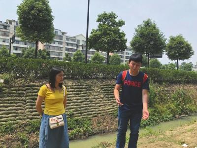 廖圳龙重返施救现场,其身后便是老人溺水的排水渠。