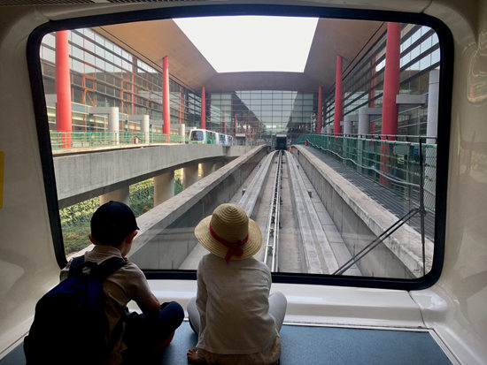 首都机场T3航站楼,前往国际登机口的小火车上,两个孩子并排坐着看着外面。一到假期,首都机场每天进出港人数达到几十万,其中许多是中小学生前往世界各地。笑槑/摄