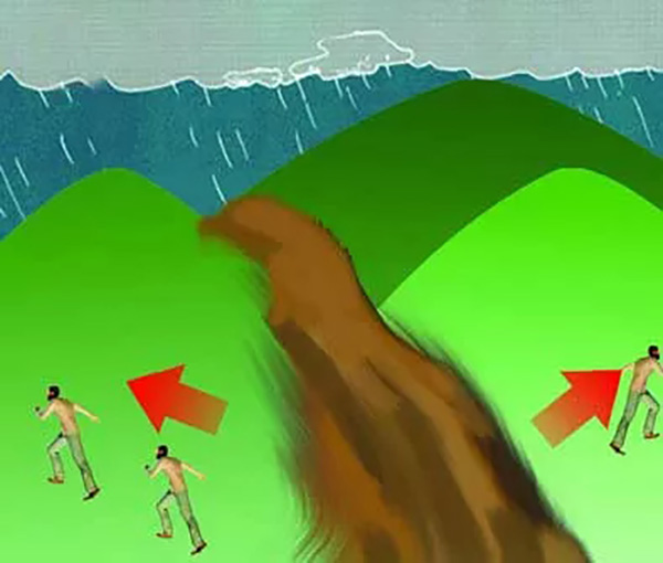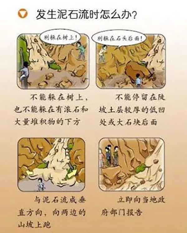 当泥石流来时,人们应立刻向与泥石流成垂直方向两边的山坡上面跑