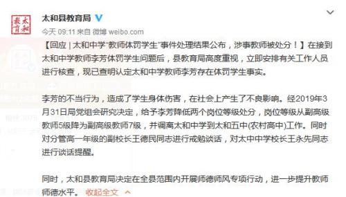 中新网4月1日电 据安徽省阜阳市太和县教育局官方微博消息,太和县教育局已查明太和中学教师李芳存在体罚学生事实。经3月31日教育局党组会研究决定,给予李芳降低两个岗位等级处分,并调离太和中学。