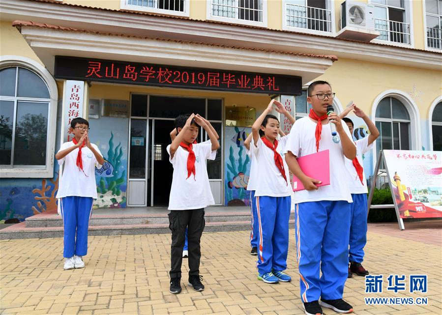 6月26日,灵山岛学校2019届小学部8名毕业生在毕业典礼上表演节目。 当日,青岛西海岸新区灵山岛学校为2019届全部10名毕业生(小学部8名,初中部2名)举行毕业典礼,下学期这些孩子都将离开海岛外出求学。 近年来,随着灵山岛岛民不断迁出以及年轻人外出打工,岛上唯一的学校生源逐年减少,但学校本着义务教育阶段“一个都不能少”的宗旨,尽责、尽心做好教育工作。 新华社记者 李紫恒 摄