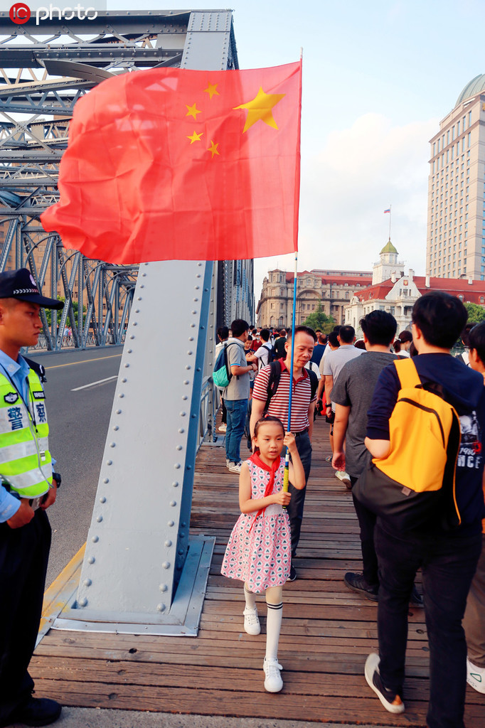 国庆长假过半但上海黄浦区各大旅游地标如人民广场花坛、南京路步行街、外滩灯光秀依旧游客人流如潮,其中大人带小孩的家庭游客占大部分,游玩景点同样也促成家长亲子爱国教育,一戴着红领巾的少年队员持巨大五星红旗游外滩吸引关注,其家长表示给她在景点留下和国旗在一起的照片比单纯的比心、比V的姿势要更有意义。(行云/IC photo)