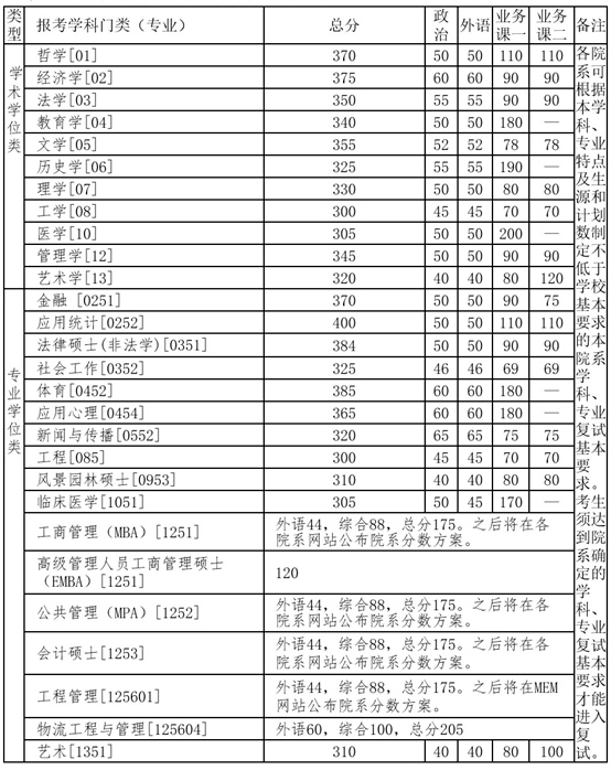“少数民族高层次骨干人才计划”(不含新疆MPA项目)考生须同时满足满分100分科目单科成绩不低于40分;满分150分科目单科成绩不低于70分;满分200分科目单科成绩不低于107分;满分300分科目单科成绩不低于140分;总分满分300分考生总分不低于195分;总分满分500分考生中,理工医考生(报考专业代码前两位为“07”、“08”或“10”)要求总分不低于270分,非理工医考生总分不低于320分。或者依据所报考院系(专业)复试分数线,总分线降10分,单科线不降。两项分数政策不可同时享受。