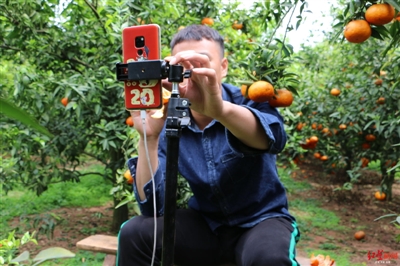 肖钦仁在自家橘子地里作直播