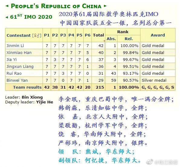钱江晚报2020年9月28日讯 北京时间9月27日晚,2020第61届国际数学奥林匹克IMO成绩揭晓,中国国家队获5金1银,蝉联总分第一,再度成功夺冠!