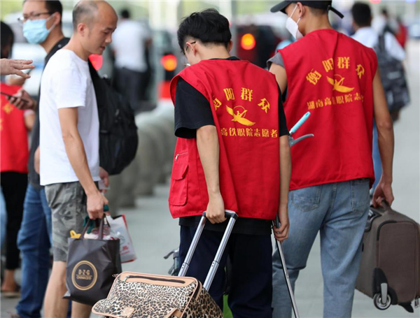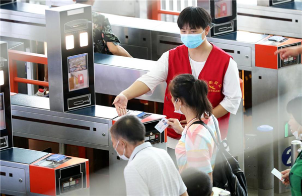 “高铁小红帽”在衡阳东站指导乘客刷卡出行