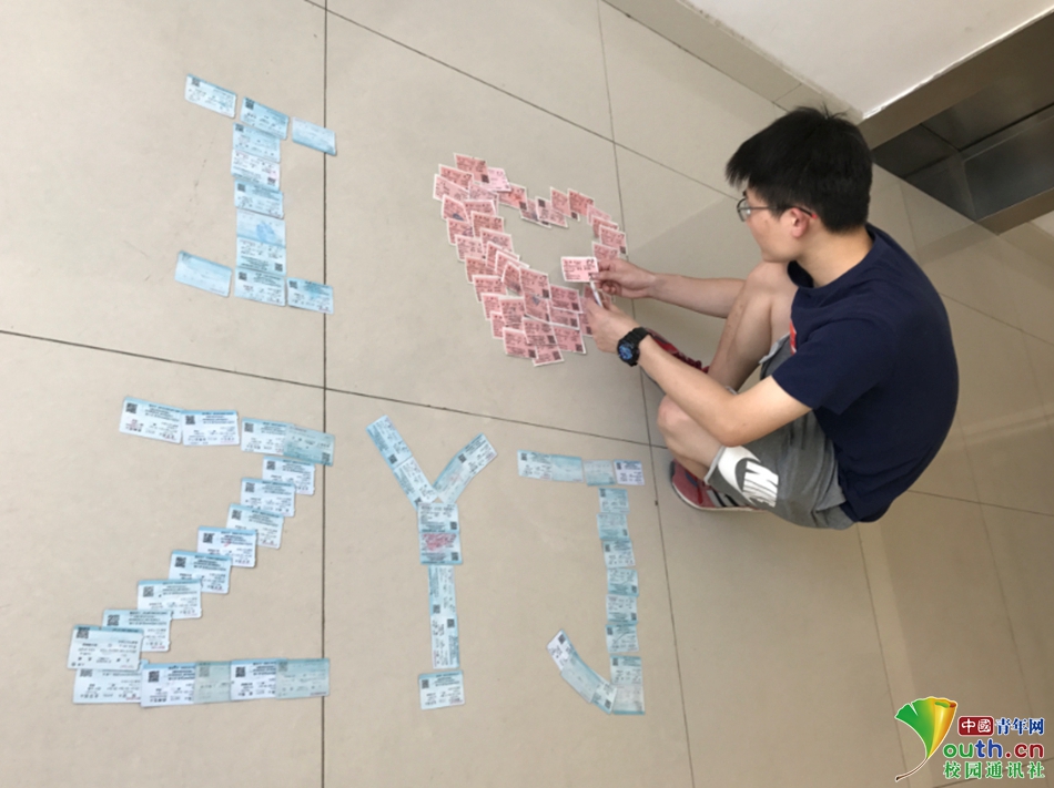03 万承圣正在用火车票摆“520”的形状。中国青年网通讯员 孙安硕 提供