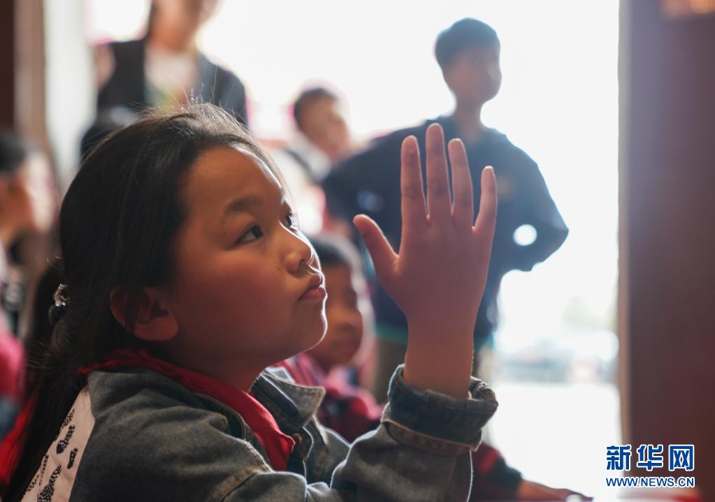 一名学生举手示意回答缪延相的问题(4月20日摄)。 新华社记者 胡晨欢 摄