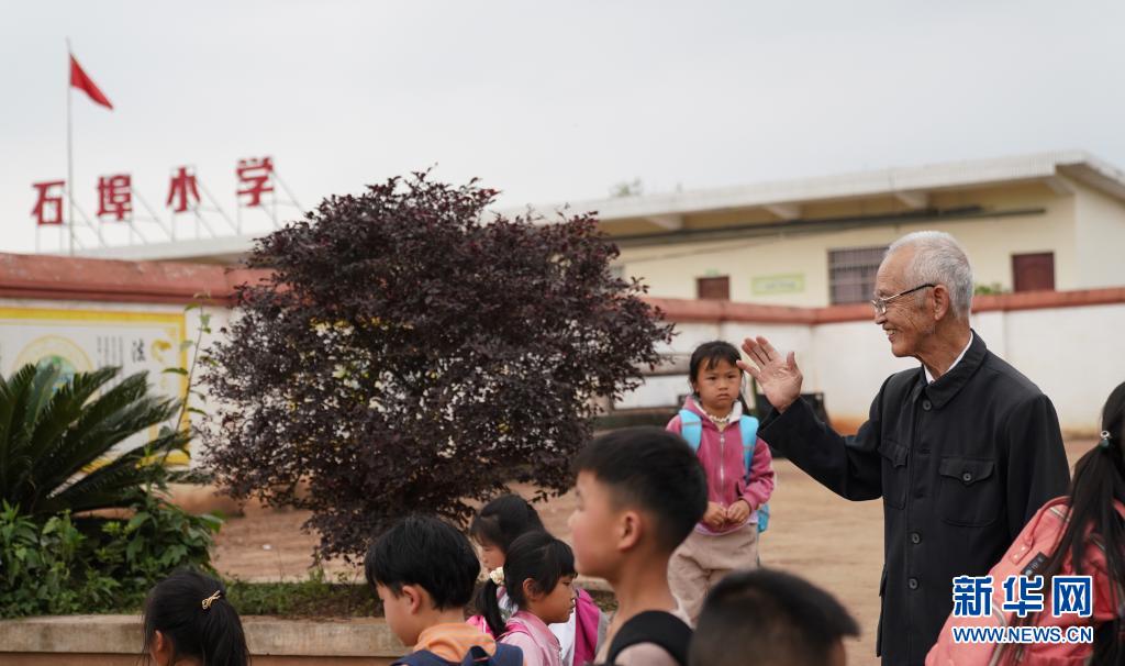 缪延相来到附近的小学迎接下课的孩子们(4月20日摄)。 新华社记者 胡晨欢 摄
