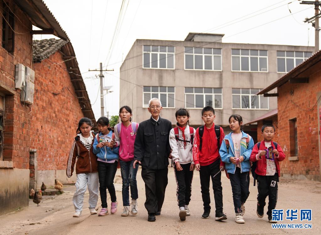缪延相(左四)和放学的孩子们一起前往校外辅导站(4月20日摄)。 新华社记者 胡晨欢 摄