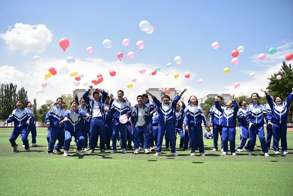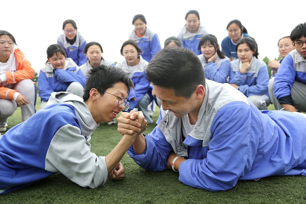 2021年5月18日,河北张家口,宣化二中学生做减压趣味游戏。