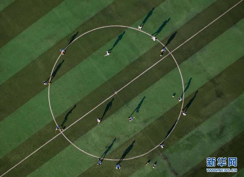 学生在宁夏盐池县第一中学运动场进行足球训练(7月15日摄,无人机照片)。