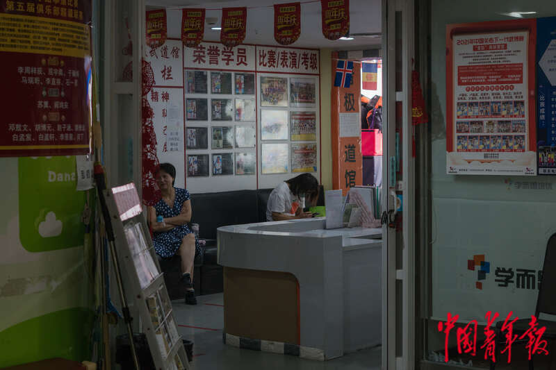 8月17日,北京市海淀区绮美大厦,一家学科教育培训机构旁的拳道馆。受“双减”政策影响,学科类培训受限,有家长选择在暑期为孩子报了武术、艺术等非学科类培训课程。实习生 王一凡/摄