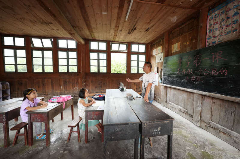 9月1日,位于大山深处的贵州省黔东南苗族侗族自治州丹寨县排调镇党干村教学点开学,教学点唯一的老师杨昌军和两名一年级新生迎来新学期。
