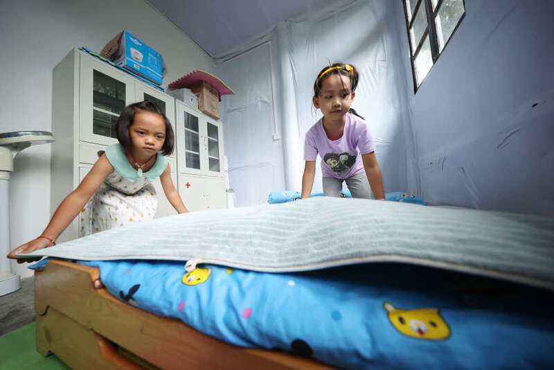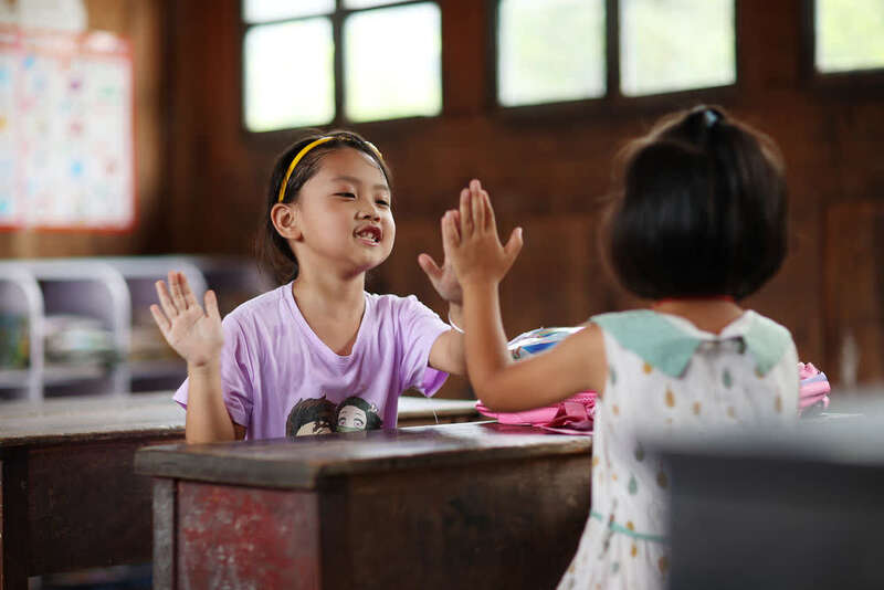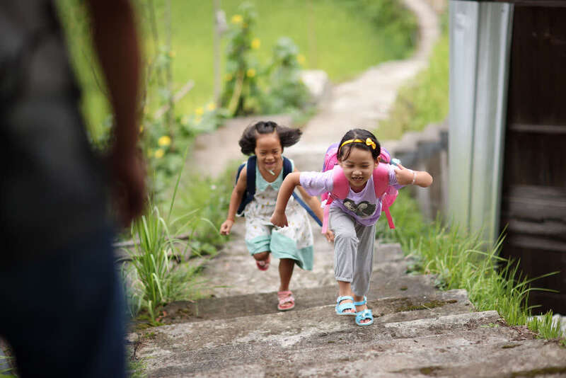 ↑9月1日,在贵州省黔东南苗族侗族自治州丹寨县排调镇党干村教学点,一年级新生莫海菲(左)与欧秀慧在课间做游戏。