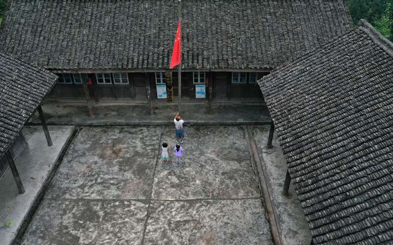 ↑9月1日,在贵州省黔东南苗族侗族自治州丹寨县排调镇党干村教学点,杨昌军带着一年级新生举行开学升国旗仪式(无人机照片)。