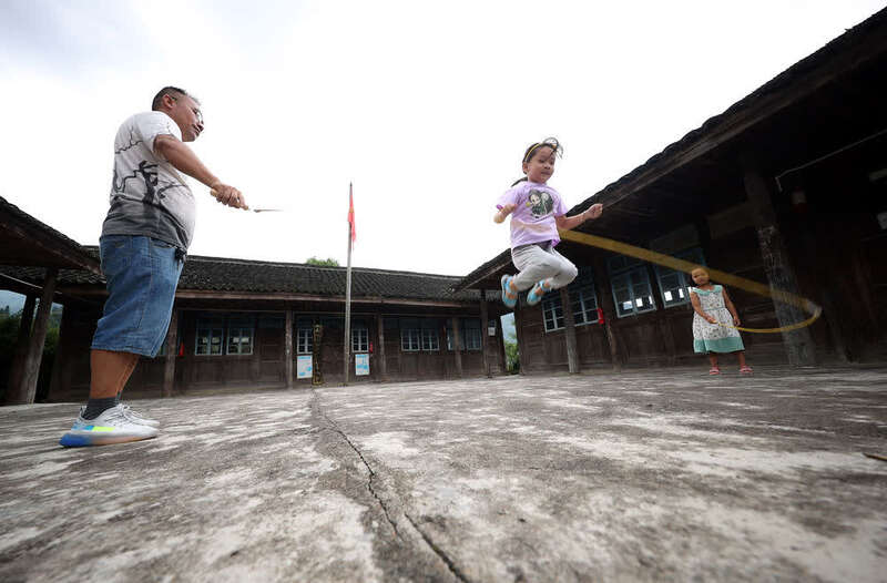 ↑9月1日,在贵州省黔东南苗族侗族自治州丹寨县排调镇党干村教学点,杨昌军与孩子们在课间跳绳。