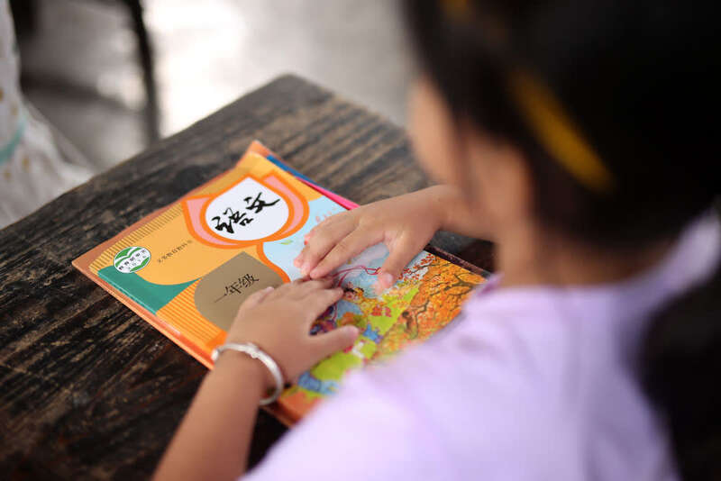 ↑9月1日,在贵州省黔东南苗族侗族自治州丹寨县排调镇党干村教学点,一年级新生莫海菲摆放好领取的新课本。新华社发(黄晓海 摄)