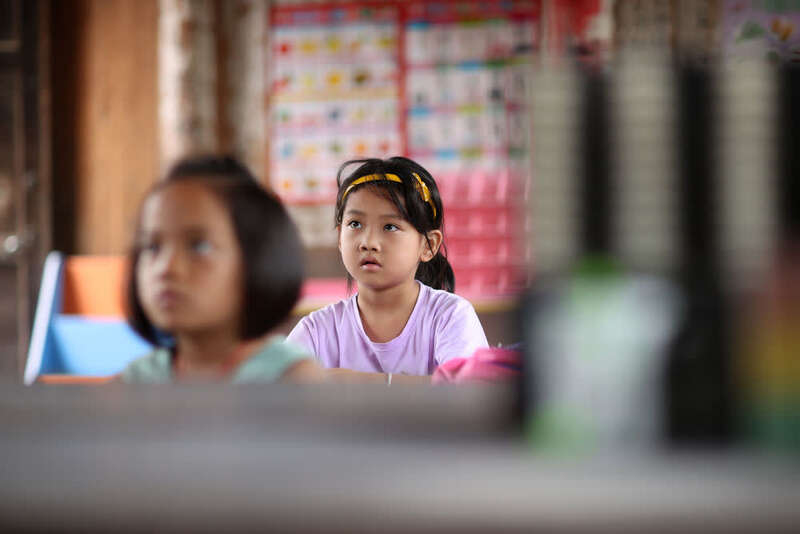 ↑9月1日,在贵州省黔东南苗族侗族自治州丹寨县排调镇党干村教学点,一年级新生莫海菲(右)与欧秀慧来学校上课。