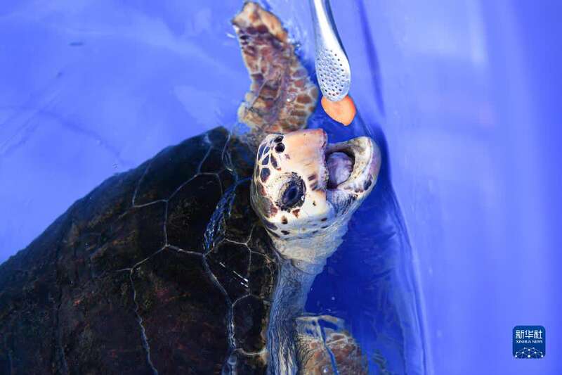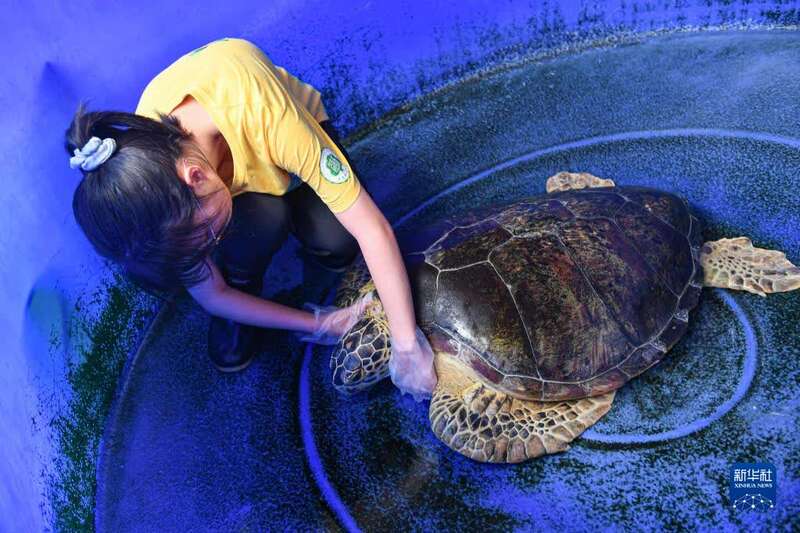 8月27日,志愿者何路在海龟救助站喂食海龟。新华社记者 蒲晓旭 摄