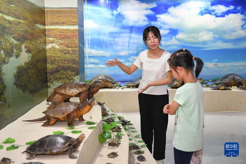 8月31日,海南师范大学海龟救助站志愿者戴诗雨在该校龟鳖博物馆内向小朋友介绍海龟、淡水龟等龟鳖类动物知识,宣传环保理念。新华社记者 蒲晓旭 摄
