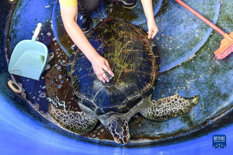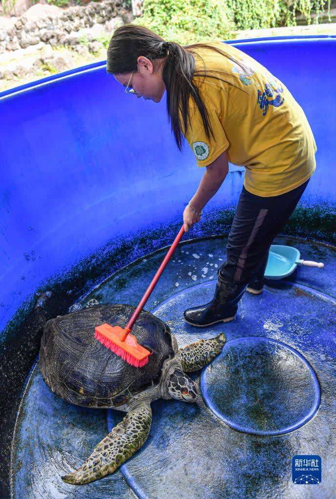 8月27日,志愿者在海龟救助站龟池内为海龟刷背。新华社记者 蒲晓旭 摄