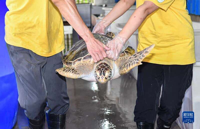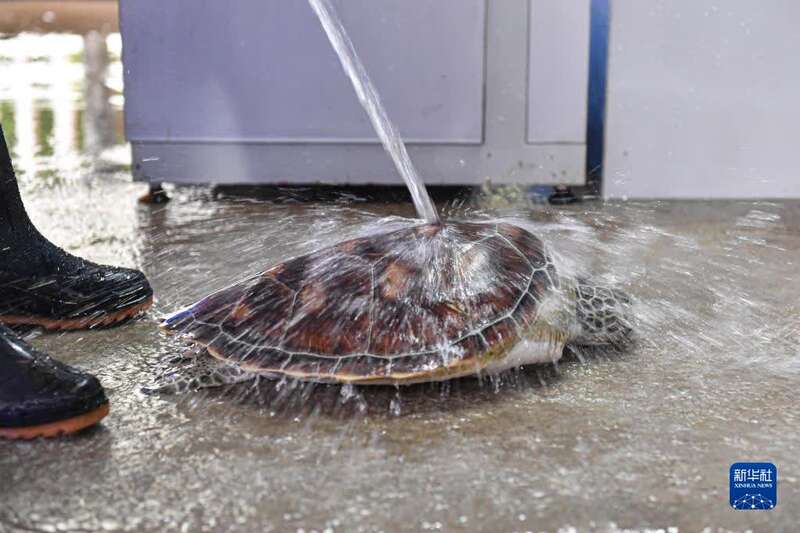 8月27日,志愿者为海龟冲洗背甲。新华社记者 蒲晓旭 摄