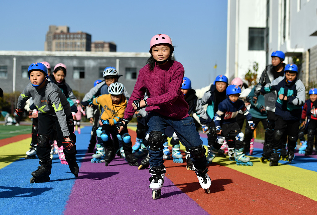 2021年11月22日,河南省商丘市,夏邑县春晖小学轮滑社团的小队员们在练习轮滑。近年来,为落实“双减”政策,发展学生体育特长,丰富校园文体生活,河南省商丘市夏邑县将轮滑运动引入校园,邀请县轮滑协会教练传授轮滑技艺,让孩子们在强健体魄的同时享受轮滑运动的快乐。
