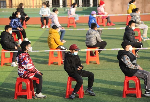 2021年12月5日上午,辽宁省大连市,甘井子区一所学校在操场上为学生进行核酸检测。