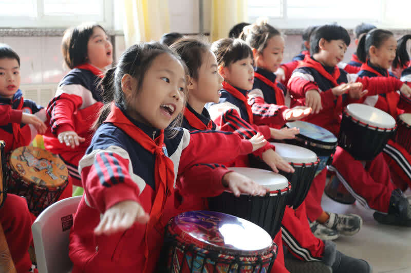 12月23日,河北唐山路北区实验小学,同学们在特色课程上进行非洲鼓的练习。李霞/摄